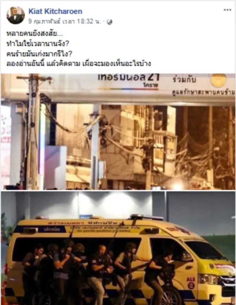 จากกรณีความวุ่นวายในจังหวัดนครราชสีมา ก็ได้มีหลายคนต่างเข้ามาแสดงความคิดเห็นกันอย่างมากมาย ล่าสุดในเฟซบุ๊ก Kiat Kitcharoen ป๋ากิ๊ก โพสต์ข้อความพร้อมเผยแพร่โดยได้ระบุว่า หลายคนยังสงสัย ทำไมใช้เวลานานจัง ทหารคนดังกล่าวมันเก่งมากรึไง ลองอ่านอันนี้ แล้วคิดตาม เผื่อจะมองเห็นอะไรบ้าง