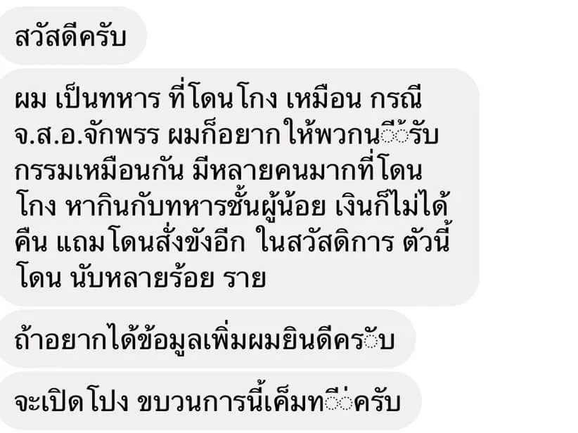 ต่อมาก็ได้โพสต์ข้อความเพิ่มเติมว่า…เปิดหลักฐาน การอมเบี้ยเลี้ยงลูกน้องของทหารชั้นผู้น้อย ที่ไม่มีใครกล้าเปิดเผยและฝากถึงผบ.ทบ.ไม่มีใครกล้ามาร้องครับเพราะเค้ากลัวไม่ถึงท่าน ผู้ร้องโดนลงโทษก่อนไม่ได้ผุดได้เกิด โดนขัง ดองเวร โดนแกล้งสารพัด ที่เปิดเผยไม่ใช่โจมตีกองทัพเพราะชมรมนี้รัก กองทัพมาตลอดชีวิตแต่ต้องการให้ตรวจสอบ การทุจริตจริงๆ