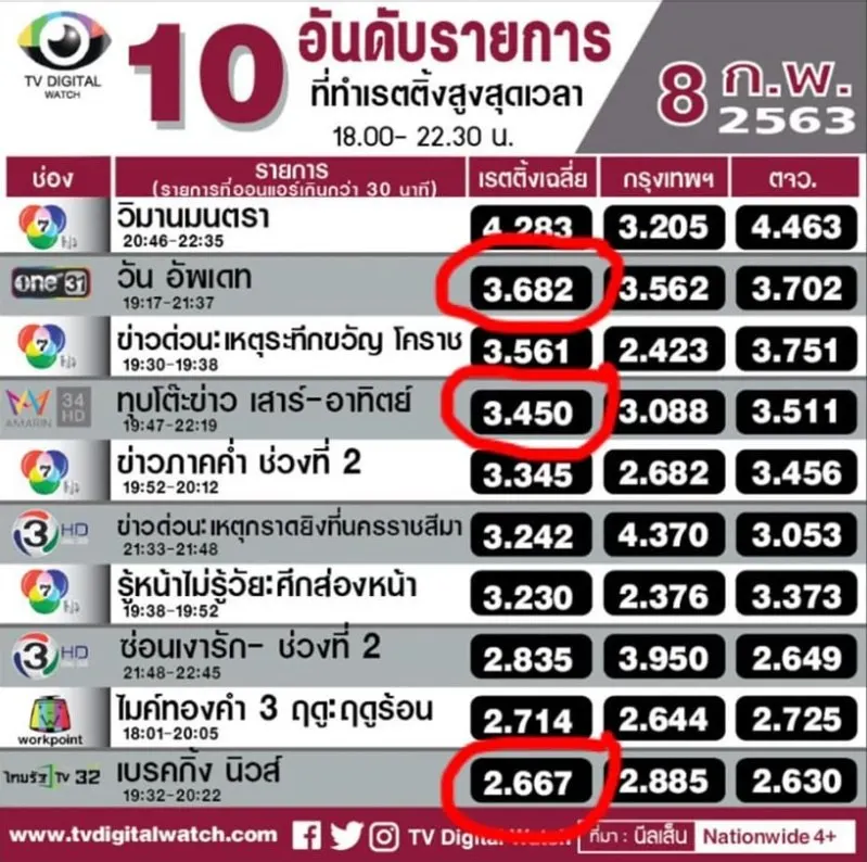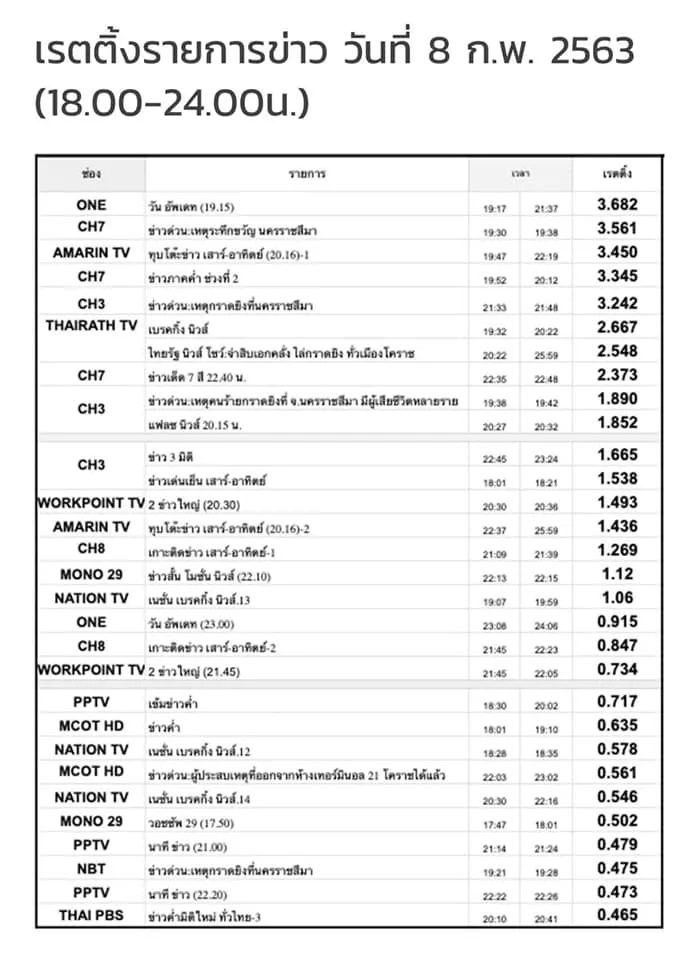 นักอ่านข่าวดัง นารากร ติยายน และ เพจ Kae Kamonphorn Worrakul ได้เผยเรทติ้งช่องทีวี ช่องต่างๆ ช่วงเหตุกราดยิง กวาดจำนวนคนดูจำนวนมาก. โดย ช่องวัน มีเรทติ้งมากที่สุด และ thaiPbs ได้เรทติ้งน้อยสุด