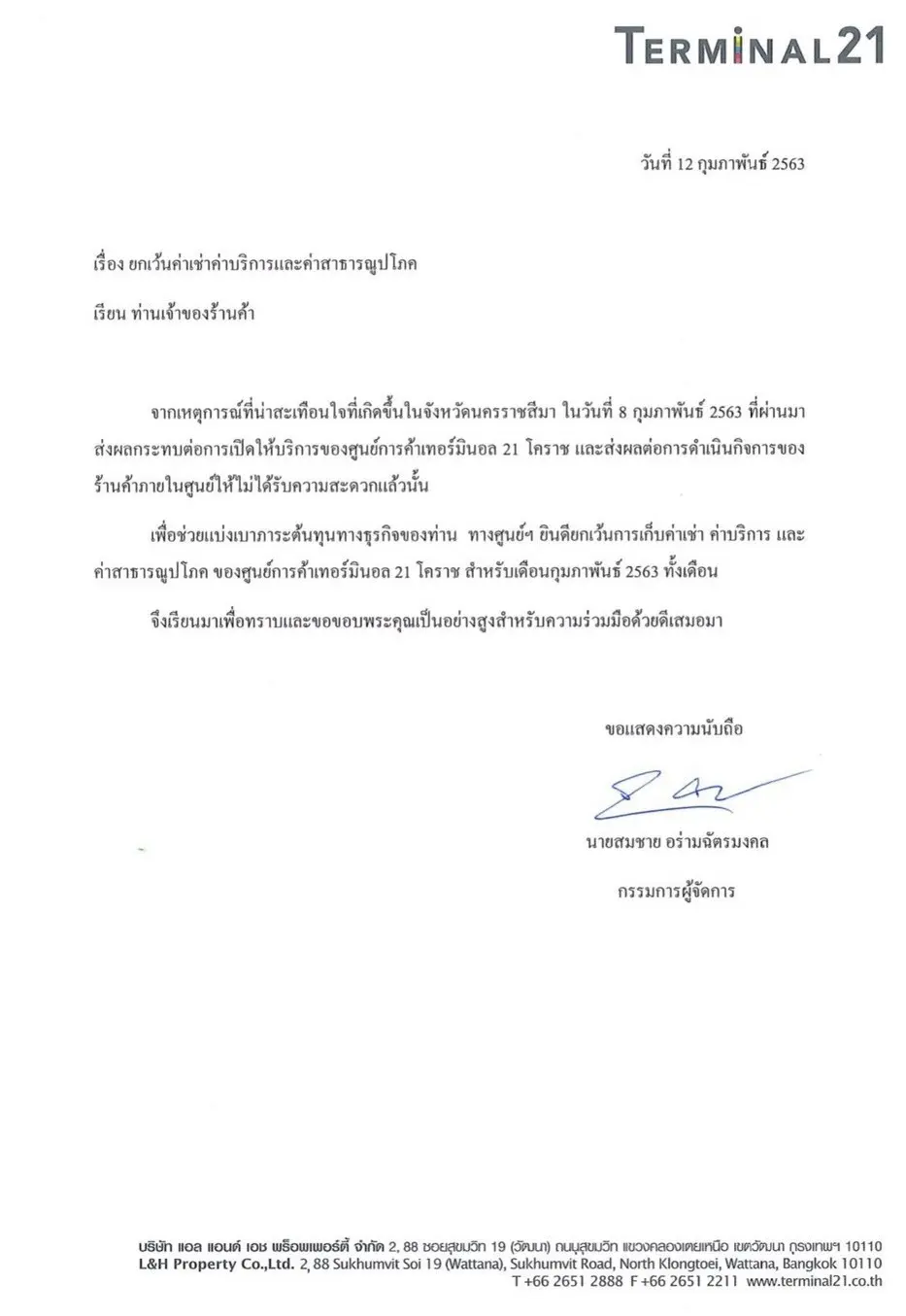 เมื่อวันที่ 12 ก.พ.63 ก่อนเปิดให้บริการในวันที่ 13 ก.พ.ทาง ศูนย์การค้า”เทอร์มินอล21โคราช” ได้ส่งหนังสือแจ้งกับผู้ประกอบการร้านค้าที่เช่าพื้นที่ภายในศูนย์การค้าฯว่า “จากเหตุการณ์ที่น่าสะเทือนใจ ที่เกิดขึ้นในจังหวัดนครราชสีมา ในวันที่ 8 กุมภาพันธ์ที่ผ่านมา ส่งผลกระทบต่อการเปิดให้บริการของ ศูนย์การค้าเทอร์มินอล21โคราช และส่งผลต่อการดำเนินกิจการของร้านค้าภายในศูนย์ฯให้ไม่ได้รับความสะดวกแล้วนั้น เพื่อช่วยแบ่งเบาภาระต้นทุนทางธุรกิจของท่าน ทางศูนย์ฯ ยินดียกเว้นการเก็บค่าเช่า ค่าบริการ และค่าสาธารณูปโภค ของศูนย์การค้าเทอร์มินอล21โคราช สำหรับของเดือนกุมภาพันธ์ทั้งเดือน”