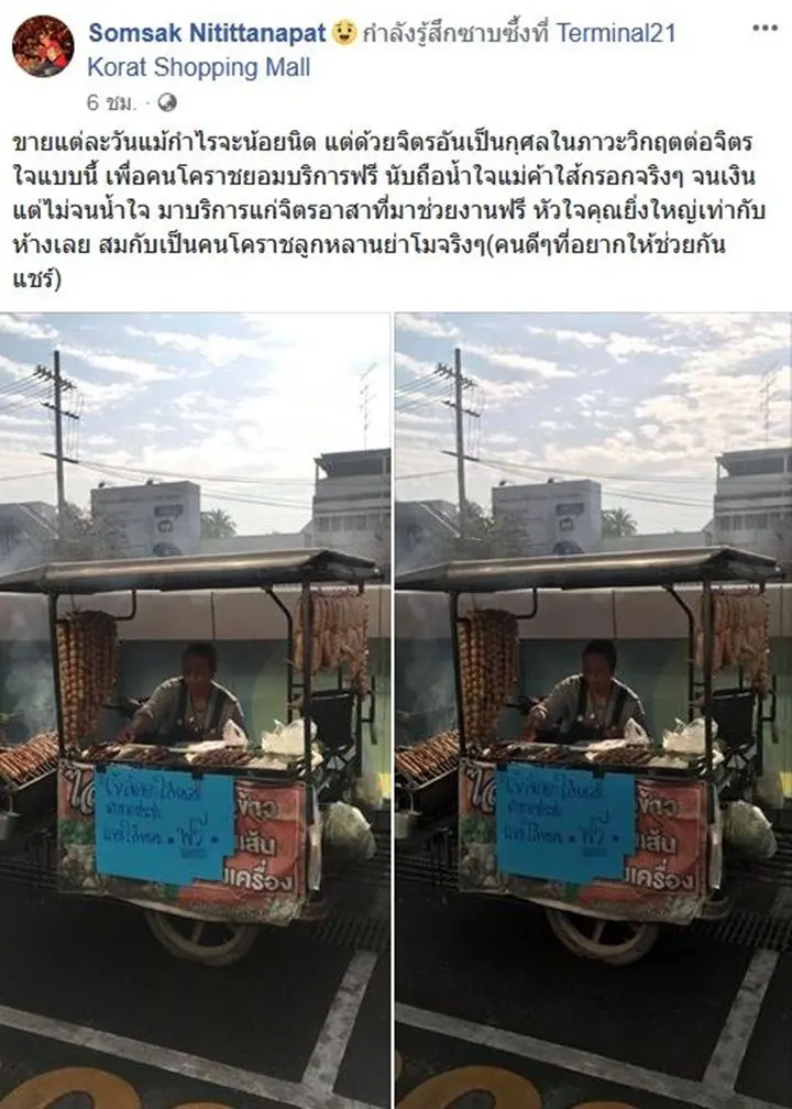 ล่าสุด ผู้ใช้เฟซบุ๊ก Somsak Nitittanapat ได้เผยอีกหนึ่งมุมดีๆ ที่พี่น้องชาวไทยได้ทำเพื่อชาวโคราช เมื่อแม่ค้าไส้กรอกรยหนึ่งได้ทำในสิ่งที่ไม่คิดว่าอุดมไปด้วยน้ำใจขนาดนี้ ซึ่งเจ้าของเฟซบุ๊กดังกล่าวได้โพสต์ภาพ พรเอมเล่าเรื่องราวว่า “อีก 1 เรื่องราวดีๆ ในวันที่เสียขวัญ ก็ยังมีน้ำใจดีๆ ให้กัน #โคราช #สุดยอดน้ำใจ..แม่ค้าไส้กรอก ชาวโคราช แม้มีทุนน้อย ขายแต่ละวัน..กำไร จะได้น้อยนิด แต่ก็อยากช่วยทุกคน…”จนเงิน แต่ไม่จนน้ำใจ”