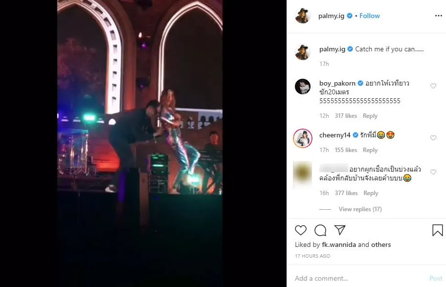 ล่าสุด ปาล์มมี่ ได้โพสต์คลิปลงอินสตาแกรมส่วนตัว จนกลายเป็นคลิปไวรัลทั่วโลกออนไลน์อีกแล้ว เมื่อเธอนั้นได้ร้องเพลงในเทศกาลดนตรี Rock Mountain ที่เขาค้อ โดยมีทีมงานเดินตามพยายามติด Wireless ให้เธอบนเวที ซึ่งงานนี้เธอไม่ยอมอยู่นิ่งทั้งร้องเต้นเดินไปเดินมาจัดเต็มความสนุกสนาน ซึ่ง เจ้าตัวลงคลิปพร้อมกับแคปชั่นบอก “catch me if you can” โดยมีเหล่าดารานักแสดงและแฟนคลับได้เข้ามาแสดงความคิดเห็นกันอย่างต่อเนื่อง