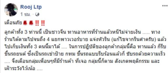 เมื่อวันที่ 13 กุมภาพันธ์ เพจ Rooj Ltp ได้โพสต์ข้อความระบุว่า เตือนภัย ลูกค้าทั้ง 3 ท่านนี้ เป็นชาวจีน ทานอาหารที่ร้านแล้วหนีไม่จ่ายเงิน ทางร้านได้ตามไปจนถึง 4 แยกพาวเวอร์บาย แจ่งหัวริน แก้ไขจากรินคำครับ แล้วไปเก็บเงินทั้ง 3 คนนี้มาได้ ในการปฎิบัติของลูกค้ากลุ่มนี้คือ ทานแล้ว ก็รีบขึ้นรถยนต์ ซึ่งเป็นรถเช่าป้าย กทม ขึ้นรถแบบรีบร้อนแล้วก็ ขับรถด้วยความเร็ว จึงเตือนกลุ่มเพื่อนๆที่มีร้านค้า ที่เจอ กลุ่มนี้ก็ตาม สังเกตพฤติกรรม และเฝ้าระวังไว้เน้อ