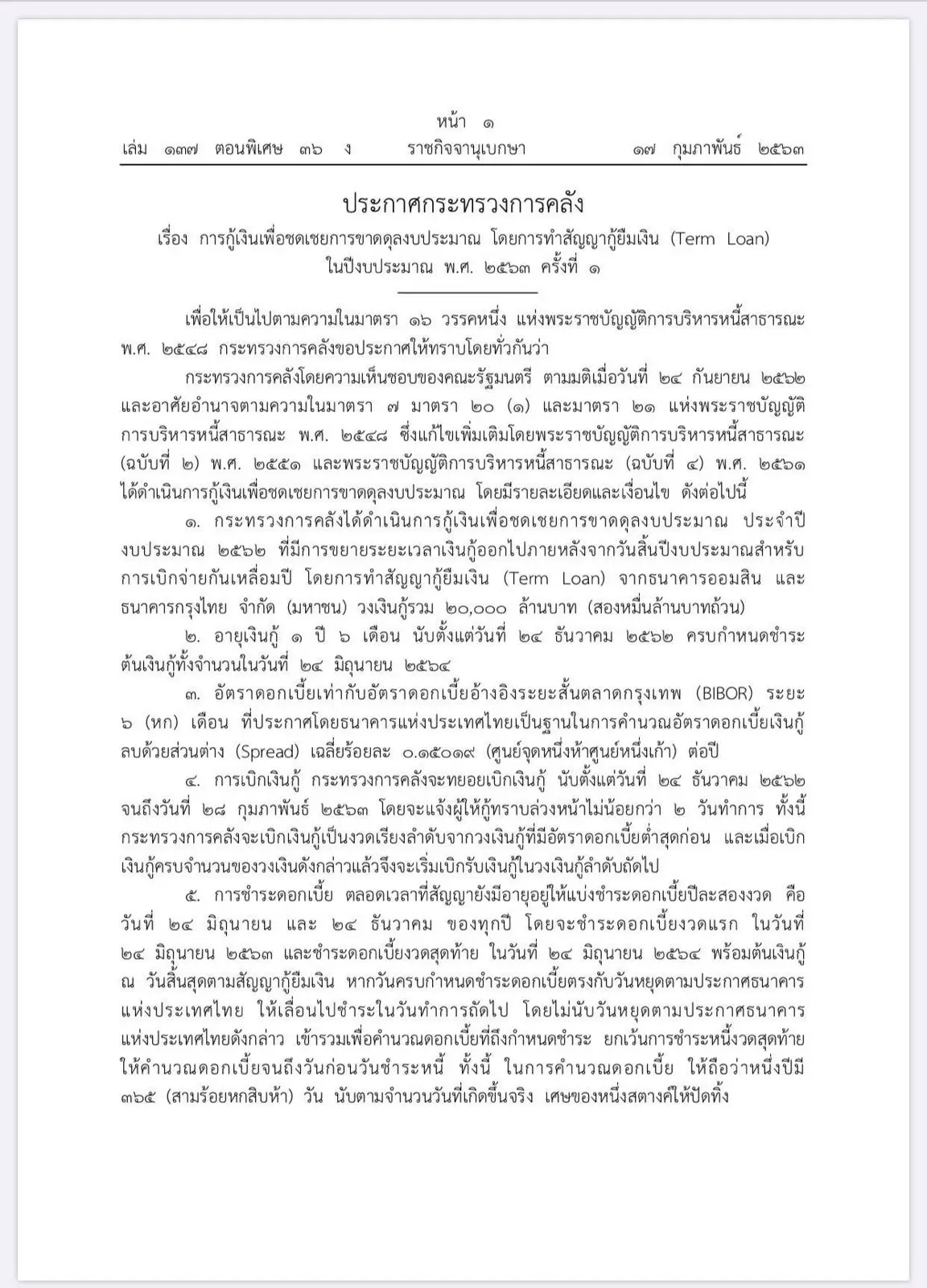 17 กุมภาพันธ์ 2563 -เว็บไซต์ราชกิจกานุเบกษา เผยแพร่ ประกาศกระทรวงการคลัง เรื่องการกู้เงินเพื่อชดเชยการขาดดุลงบประมาณ โดยการทำสัญญากู้ยืมเงิน (Term Loan) ในปีงบประมาณ พ.ศ.2563 ครั้งที่ 1 ความว่า