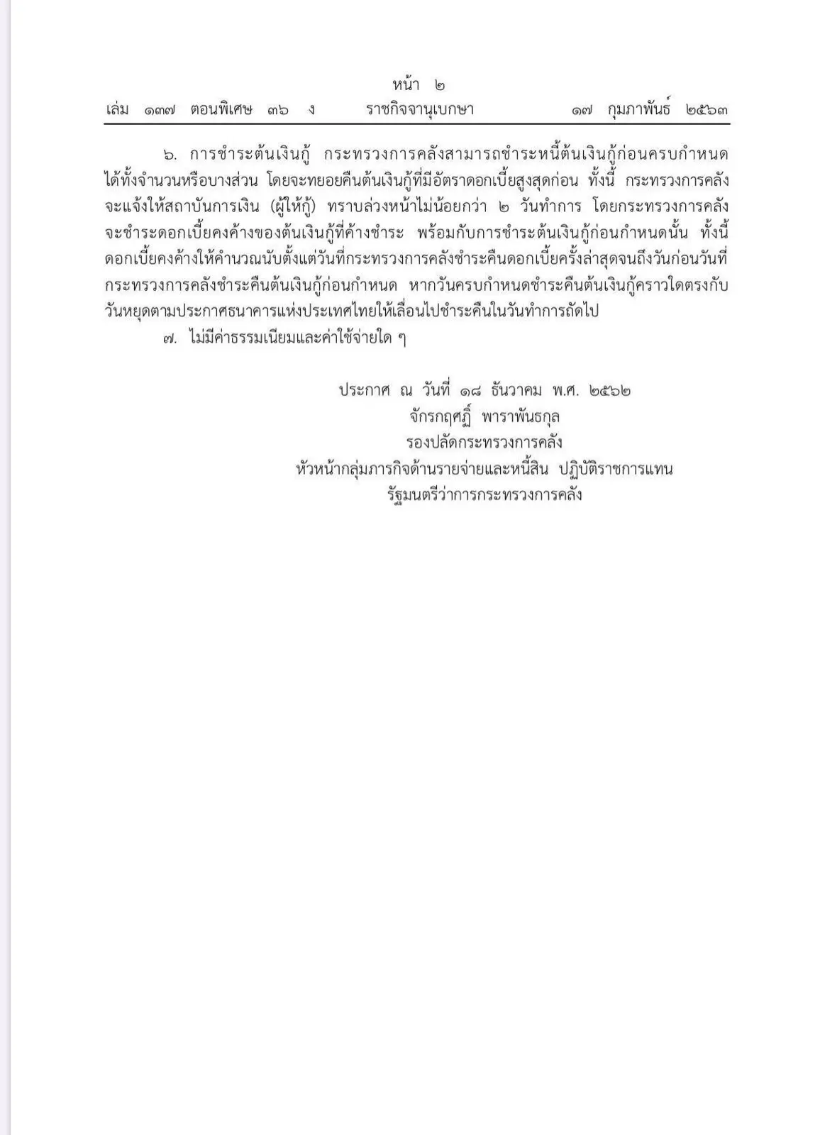 6. การชำระต้นเงินกู้ กระทรวงการคลังสามารถชำระหนี้ต้นเงินกู้ก่อนครบกำหนด ได้ทั้งจำนวนหรือบางส่วน โดยจะทยอยคืนต้นเงินกู้ที่มีอัตราดอกเบี้ยสูงสุดก่อน ทั้งนี้ กระทรวงการคลัง จะแจ้งให้สถาบันการเงิน (ผู้ให้กู้) ทราบล่วงหน้าไม่น้อยกว่า 2 วันทำการ โดยกระทรวงการคลัง จะชำระดอกเบี้ยคงค้างของต้นเงินกู้ที่ค้างชำระ พร้อมกับการชำระต้นเงินกู้ก่อนกำหนดนั้น ทั้งนี้ ดอกเบี้ยคงค้างให้คำนวณนับตั้งแต่วันที่กระทรวงการคลังชำระคืนดอกเบี้ยครั้งล่าสุดจนถึงวันก่อนวันที่ กระทรวงการคลังชำระคืนต้นเงินกู้ก่อนกำหนด หากวันครบกำหนดชำระคืนต้นเงินกู้คราวใดตรงกับ วันหยุดตามประกาศธนาคารแห่งประเทศไทยให้เลื่อนไปชำระคืนในวันทำการถัดไป