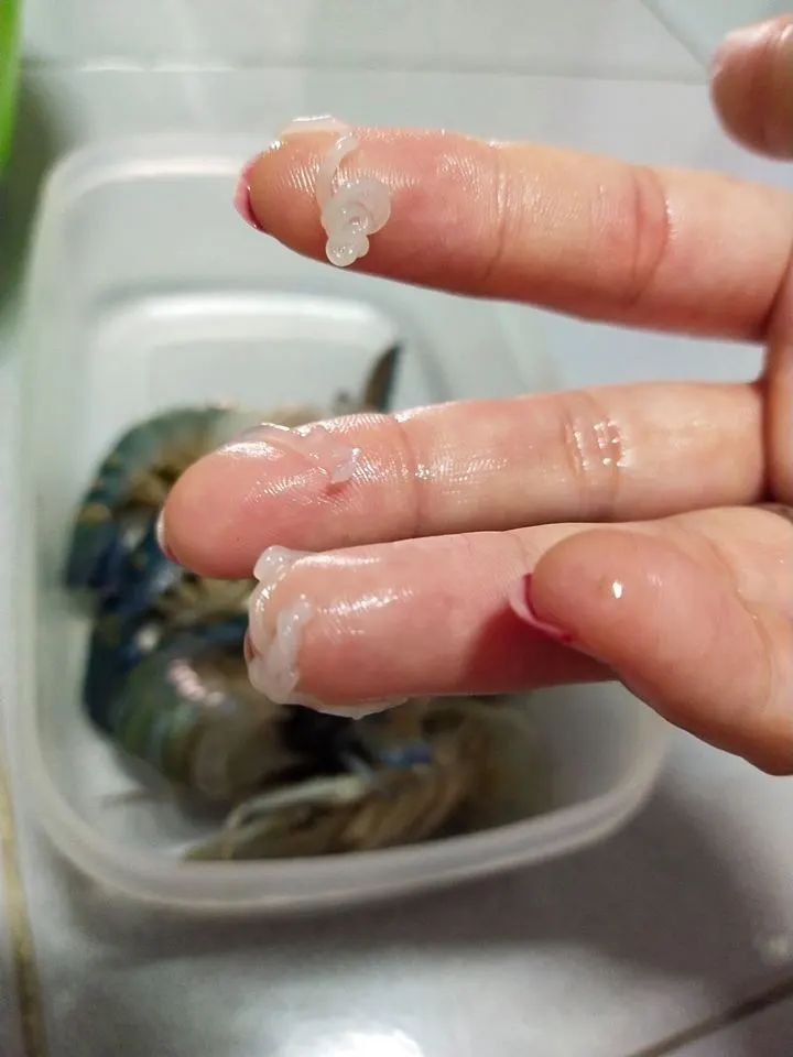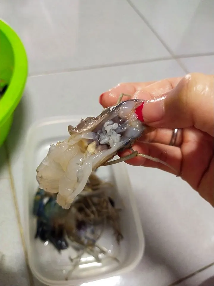 ผู้ใช้เฟซบุ๊กโพสต์ข้อความสั้นๆระบุว่า “สอบถามค่ะ มันคืออะไรในหัวกุ้ง ซื้อมาตลาดนัดเมือวานค่ะ”