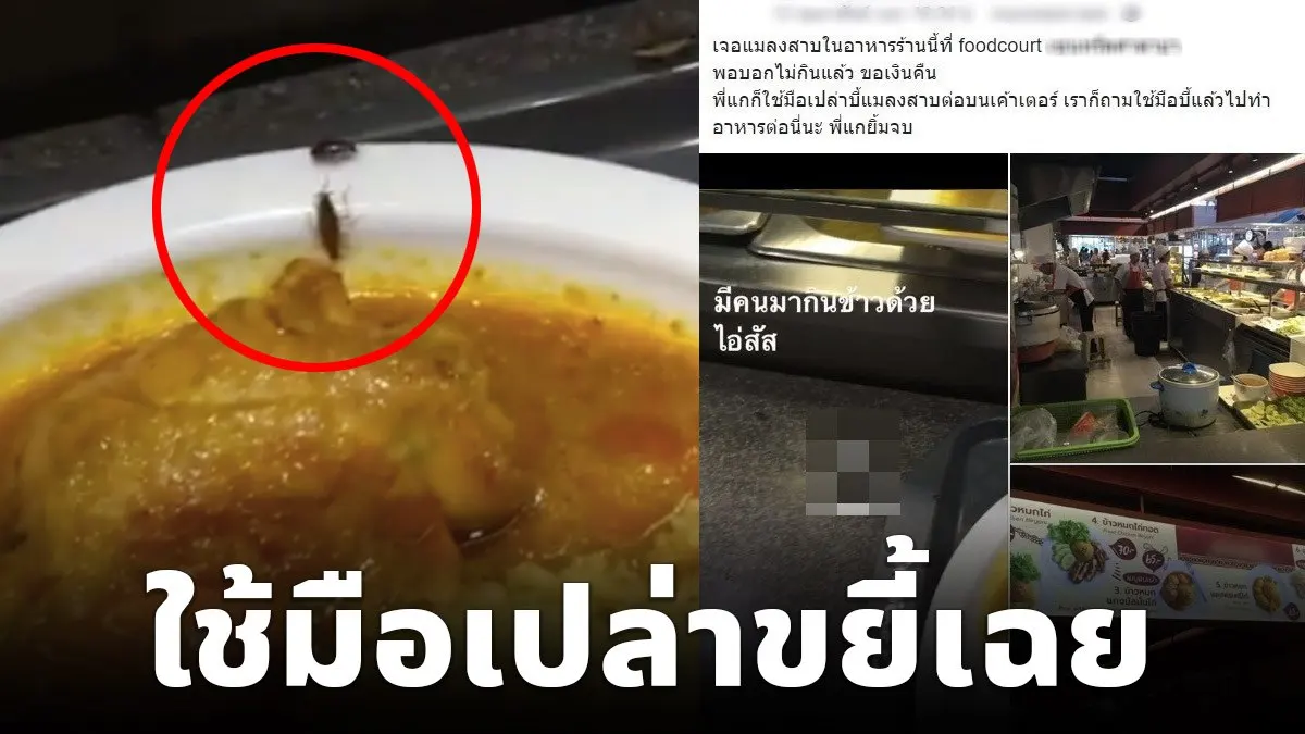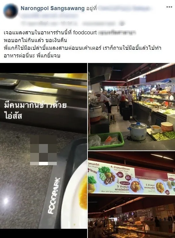 ผู้ใช้เฟซบุ๊กโพสต์ข้อความระบุว่า “เจอแมลงสาบในอาหารร้านนี้ที่ foodcourt xxx xxx พอบอกไม่กินแล้ว ขอเงินคืน พี่แกก็ใช้มือเปล่าบี้แมลงสาบต่อบนเค้าเตอร์ เราก็ถามใช้มือบี้แล้วไปทำอาหารต่อนี่นะ พี่แกยิ้มจบ”