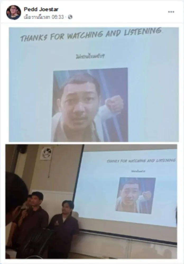 เรียกได้ว่าเป็นเรื่องราวที่มีคนต่างเข้ามาแสดงความคิดเห็นกันเป็นจำนวนมาก จากกรณีผู้ใช้เฟซบุ๊ก Pedd Joestar โพสต์ภาพนักศึกษากลุ่มหนึ่ง ออกมายืนรายงานหน้าชั้นกัน 3 คน โดยมีภาพในจอโปรเจคเตอร์เป็นตัวช่วยในการพูดถึงเพื่อให้เพื่อนๆในชั้นเรียนได้เข้าใจกันง่ายขึ้น