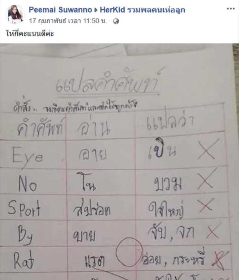 เป็นอีกหนึ่งเรื่องราวที่น่ารักมากๆเลยทีเดียวจ้า สำหรับการบ้านที่ครูให้แต่หนูน้อยเขียนคำตอบได้จริงแต่มันผิดเนี่ยนะสิ โดยผู้ใช้เฟซบุ๊กชื่อ Peemai Suwanno ได้โพสต์ภาพการบ้านของบุตรชาย พร้อมระบุข้อความว่า ให้กี่คะแนนดีค่ะ