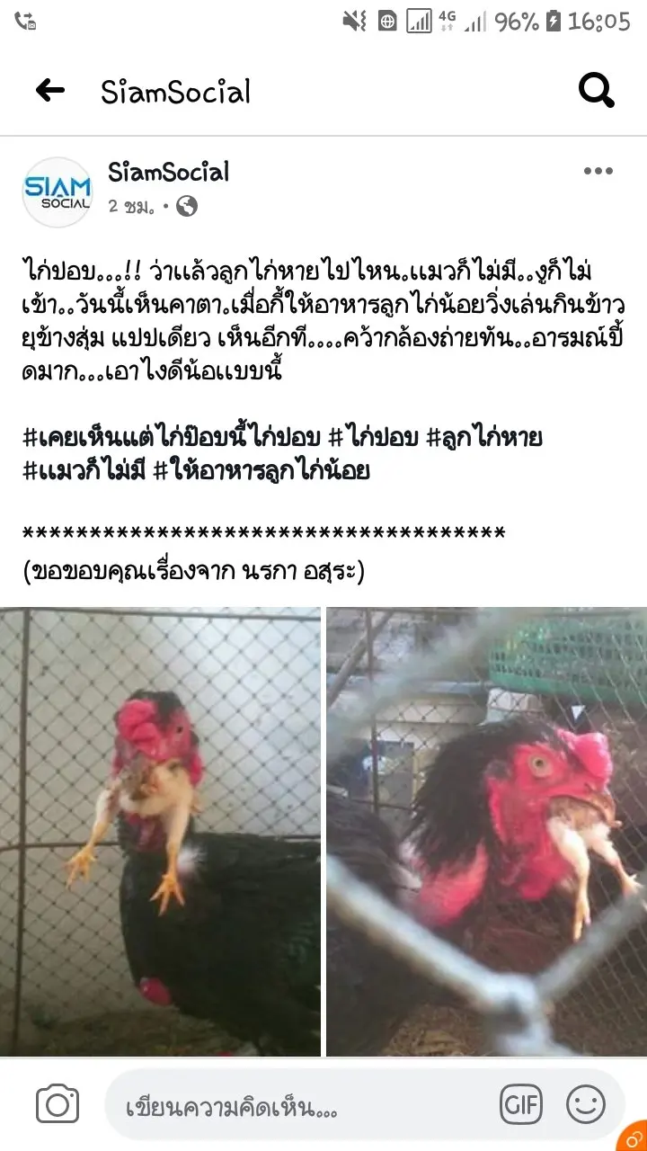 มีเพจในเฟสบุ้คชื่อ 'SiamSocial' ได้ลงรูปภาพไก่ที่กำลังกลืนลูกไก่ตัวน้อยเข้าไปแล้วครึ่งตัวอย่างไม่น่าเชื่อ