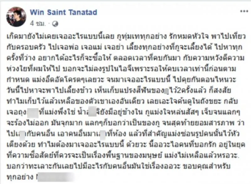 จากกรณีสมาชิกผู้ใช้เฟซบุ๊กรายหนึ่ง ได้โพสต์คลิปพร้อมภาพถ่าย หลังจากที่จับได้ว่าฝ่ายหญิงมีคนอื่น พร้อมโพสต์เล่าเรื่องความรักที่เคยเกิดขึ้น ซึ่งฝ่ายชายระบุว่า ทุ่มเททุกอย่าง รักหมดใจ รวมทั้งเคยพาไปเที่ยวกับครอบครัว จนกลายเป็นที่ถูกพูดถึงอย่างกว้างขวางในโซเชียลมีเดีย ตามที่เสนอข่าวไปแล้วนั้น