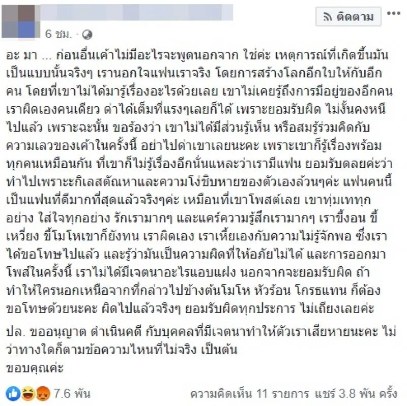 ล่าสุดวันที่ 21 ก พ สาวที่ปรากฏในคลิปได้โพสต์ข้อความเกี่ยวกับเรื่องถึงฝ่ายชายโพสต์ โดยระบุว่า อะ มา ก่อนอื่นเค้าไม่มีอะไรจะพูดนอกจาก ใช่ค่ะ เหตุการณ์ที่เกิดขึ้นมันเป็นแบบนั้นจริง ๆ เรามีคนอื่นจริง โดยการสร้างโลกอีกใบให้กับอีกคน โดยที่เขาไม่ได้มารู้เรื่องอะไรด้วยเลย เขาไม่เคยรู้ถึงการมีอยู่ของอีกคน เราผิดเองคนเดียว ว่าได้เต็มที่แรง ๆ เลยก็ได้ เพราะยอมรับผิด ไม่งั้นคงหนีไปแล้ว