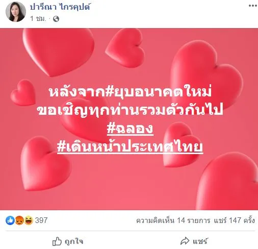 "ปารีณา ไกรคุปต์ " โพส ฉลอง หลังจาก พรรคอนาคตใหม่ ถูกยุบ