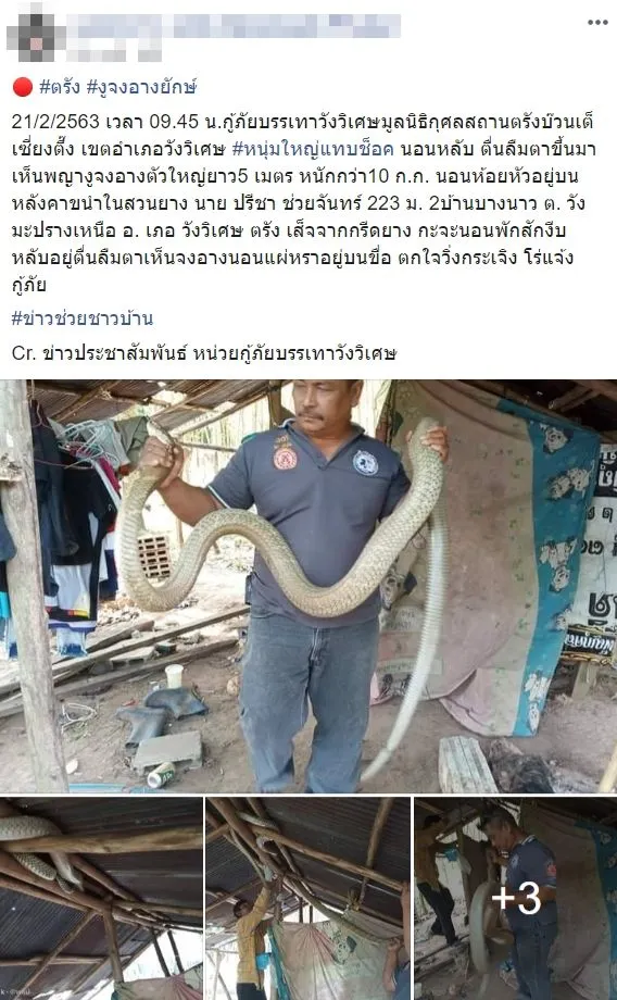โดยเหตุการณ์ดังกล่าวเกิดขึ้นหลังเสร็จจากกรีดยาง กะจะนอนพักสักงีบ แต่พอลืมตาขึ้นมากลับพบงูจงอางขนาดใหญ่นอนแผ่หราอยู่บนขื่อ ทำเอา นาย ปรีชา ตกใจวิ่งกระเจิง ก่อนโทรแจ้งกู้ภัยบรรเทาวังวิเศษมูลนิธิกุศลสถานตรัง บ้วนเต็กเซี่ยงตึ๊ง เขตอำเภอวังวิเศษ ให้มาช่วยจับ