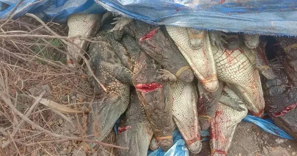 ชาวบ้าน รวมถึงเจ้าหน้าที่บางส่วน ช่วยกันขนย้ายซากจระเข้ขนาดความยาวประมาณ 1 -1.20 เมตรจำนวน 80 ตัว ที่ถูกเทกระจาดกระจัดกระจายอยู่บนข้างไหล่ทางของถนน ลงมากองรวมกันไว้ที่ข้างทาง