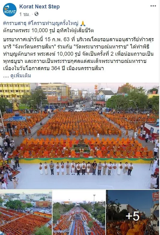 เเละเมื่อไม่นานมานี้ ทางด้านเฟซบุ๊ค Korat Next Step นั้นก็ได้โพสต์ภาพ ชาวโคราชทำบุญครั้งใหญ่ ตักบาตรพระ 10,000 รูป อุทิศให้ผู้เสียชีวิต เหตุกราดยิงห้างกลางเมือง!