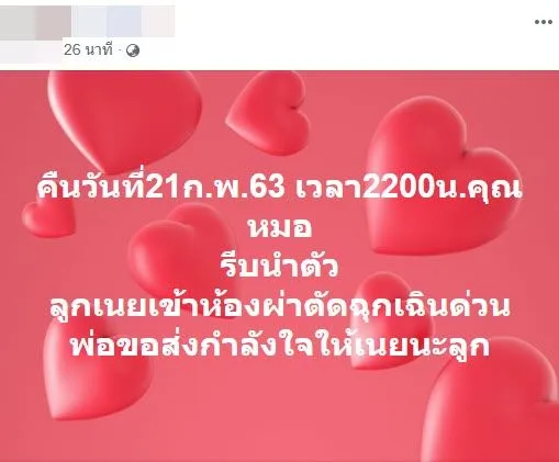 ด้านพ่อ โพสต์ว่า คืนวันที่21ก.พ.63 เวลา2200น.คุณหมอรีบนำตัว ลูกเนยเข้าห้องผ่าตัดฉุกเฉินด่วน พ่อขอส่งกำลังใจให้เนยนะลูก
