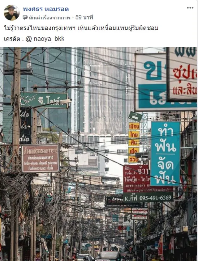 กลายเป็นอีกภาพที่ชาวโซเชียล ต่างก็เข้ามาแสดงความคิดเห็นและต่างก็วิจารณ์เป็นจำนวนมาก เมื่อได้มีผู้ใช้เฟซบุ๊ค พงศธร หอมรอด ได้โพสต์ภาพ ได้แชร์ภาพของจุดหนึ่งในกรุงเทพที่ถูกถ่ายมาโดย naoya bkk เป็นภาพซอยแห่งหนึ่งที่มีสายไฟรก รุงรังมากๆ มองไม่เห็นวิวบ้านเมืองโดยรอบเลยทีเดียว เพราะมันรกมาก
