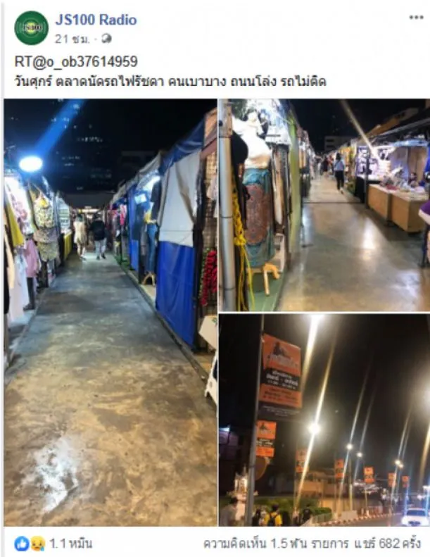 เป็นอีกหนึ่งภาพที่ชาวเน็ตเข้ามาแสดงความเห็นกันเป็นจำนวนมาก เมื่อวันที่ 21 กุมภาพันธ์ที่ผ่านมา เพจเฟสบุ๊ค JS100 Radio ได้เผยภาพตลาดนัดรถไฟที่รัชดา ซึ่งแทบทุกทางเดินต่างก็เงียบเหงา มีคนมาเดินตลาดน้อยกว่าปกติ
