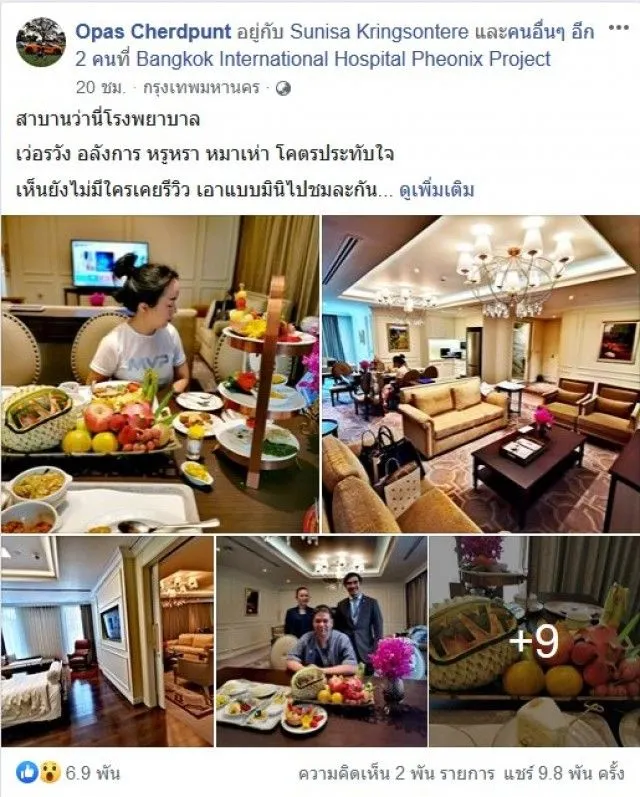 ในโรงบาลเอกชนทั่วไป ห้องพักสำหรับผู้เข้ารับการรักษา จะมีตั้งแต่ระดับธรรมดา และระดับหรูขึ้นไป ล่าสุดห้องโรงบาลที่กรุงเทพได้มีห้องหรูหรา ระดับโรงแรม 5 ดาวเลยทีเดียว โดยทางผู้ใช้เฟซบุ๊ค Opas Cherdpunt ได้โพสต์รีวิว ภาพของโรงบาลที่หรูระดับโรงแรม 5 ดาว ค่าห้องคืนละ 120000 ซึ่ง Opas Cherdpunt ได้โพสต์ภาพด้านในห้องพักในโรงบาล พร้อมข้อความใจความว่า