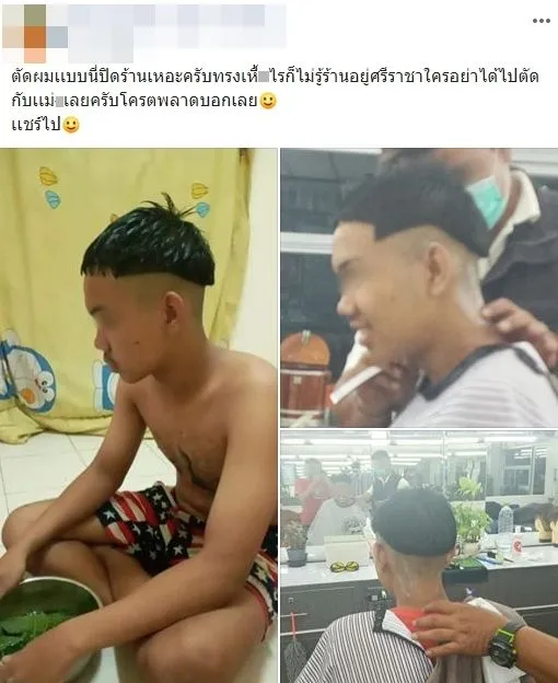 ผู้ใช้เฟซบุ๊กโพสต์ข้อความระบุว่า “ตัดผมเเบบนี้ปิดร้านเหอะครับทรงเ...้xไรก็ไม่รู้ร้านอยู่ศรีราชาใครอย่าได้ไปตัดกับเเม่xเลยครับโครตพลาดบอกเลย เเชร์ไป”