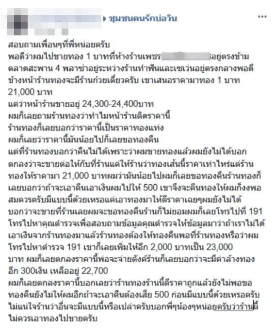 ซึ่งโพสต์ดังกล่าว ได้ระบุข้อความว่า ” สอบถามเพื่อนๆที่พี่หน่อยครับ พอดีว่าผมไปขายทอง 1 บาทที่ห้างร้านเพชรทองดีเยาวราชอยู่ตรงข้ามตลาดสะพาน 4 พลาซ่าอยู่ระหว่างร้านทำฟันและเซเว่นอยู่ตรงกลางพอดีข้างหน้าร้านทองจะมีร้านก๋วยเตี๋ยวครับ เขาเสนอราคามาทอง 1 บาท 21,000 บาท แต่ว่าหน้าร้านขายอยู่ 24,300-24,400บาท ผมก็เลยถามร้านทองว่าทำไมหน้าร้านติดราคานี้ ร้านทองก็เลยบอกว่าราคานี้เป็นราคาทองแท่ง ผมก็เลยว่าราคานี้มันน้อยไปก็เลยขอทองคืน