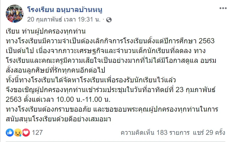 จากการปรับตัวของหลายๆ อย่าง ไม่ว่าจะเป็นการค้าขายที่ขายยากขึ้น หรือว่าจะเป็นการปิดกิจการลงของโรงงาน บริษัทต่างๆ มีการลดจำนวนพนักงาน ซึ่งน่าเป็นห่วงเป็นอย่างมาก ล่าสุด ทางด้านเพจ โรงเรียนอนุบาลบ้านหนู ก็ได้ออกมาประกาศถึงผู้ปกครองว่าจะมีการปิดกิจการโรงเรียนลงในปี 63 เพราะว่าปัญหาภาวะเศรษฐกิจ นักเรียนลดน้อยลง