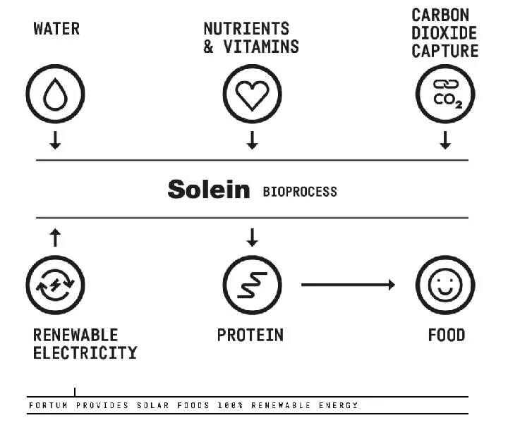กระบวนการผลิต Solein เริ่มจากดึงเอา CO2 ออกมาจากอากาศโดยใช้เทคโนโลยีดักจับ CO2 (Carbon Capture Technology) ซึ่งในปัจจุบันมีความก้าวหน้าไปมากแล้ว จากนั้นมันจะถูกนำไปผสมกับน้ำ, สารอาหาร และวิตามิน แล้วเข้าสู่กระบวนการหมักตามธรรมชาติโดยใช้พลังงานแสงอาทิตย์ การผลิต Solein จึงช่วยลด CO2 ในชั้นบรรยากาศลงได้มาก และเนื่องจาก CO2 ส่วนเกินในชั้นบรรยากาศมีอยู่มากมายมหาศาล มันจึงเป็นแหล่งอาหารที่ยั่งยืน