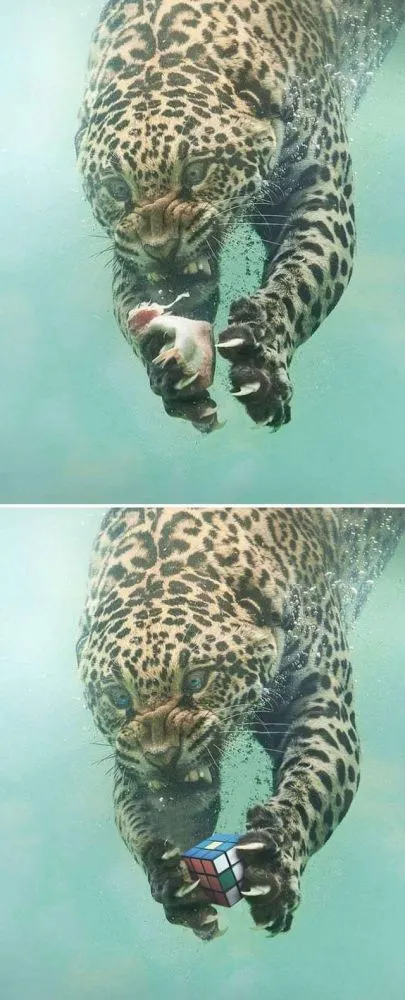 #24 เสือที่กำลังจับปลากลายเป็นภาพสุดฮาเมื่อเปลี่ยนปลาของมันให้กลายเป็นรูบิก