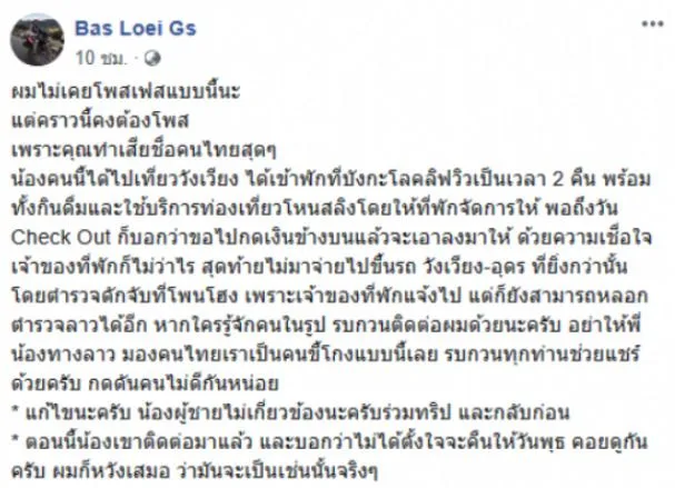 หากใครรู้จักคนในรูป รบกวนติดต่อผมด้วยนะครับ อย่าให้พี่น้องทางลาว มองคนไทยเราเป็นคนขี้โกงแบบนี้เลย รบกวนทุกท่านช่วยแชร์ด้วยครับ กดดันคนไม่ดีกันหน่อย แก้ไขนะครับ น้องผู้ชายไม่เกี่ยวข้องนะครับร่วมทริป และกลับก่อน ตอนนี้น้องเขาติดต่อมาแล้ว และบอกว่าไม่ได้ตั้งใจจะคืนให้วันพุธ คอยดูกันครับ ผมก็หวังเสมอ ว่ามันจะเป็นเช่นนั้นจริงๆ”