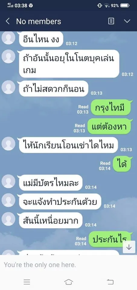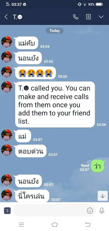 ตอนเกิดเหตุ จู่ๆเวลาตี 3 แม่มาเคาะประตูห้องนอน… เราก็เดินไปเปิดแบบงงๆ แม่ถามว่า จะเอาสมุดธนาคารแม่ไปทำประกันหรอ? แล้วนักเรียนนี่คืออะไรอะ…. เราได้ยินแล้วงงมากๆเพราะไม่รู้เลยแม่พูดเรื่องอะไรอยู่ แม่เลยเปิดโทรศัพขึ้นมาให้ดู ปรากฎว่ามีแชทที่เป็นทั้งรูปและชื่อไลน์เราในตอนนี้!!
