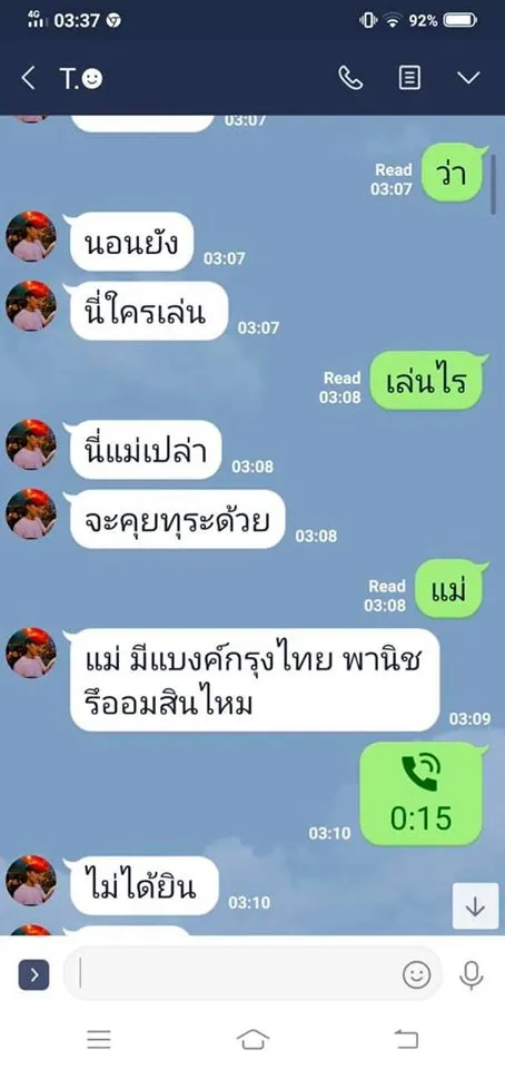 ซึ่ง ณ ตอนนั้น คือแม่ไม่ได้คิดไรเลยแล้วคิดว่าเป็นเราจริงๆ แล้วเราเข้าใจแม่เพราะในการคุยกับลูกคือแม่จะไว้ใจลูกมากๆ และ ณ ตอนนั้นแม่เราก็เพิ่งตื่น + ก็ไม่ได้คิดอะไร ถึงจะตะหงิดใจในระดับนึงเพราะคำพูดที่เราใช้พูดกับแม่ในไลน์ไม่ใช่แบบนี้เลย ต่อมา ทางมิจฉาชีพก็ทำการถามแม่เราว่า แม่ทำธุรกิจส่วนตัวใช่ไหม