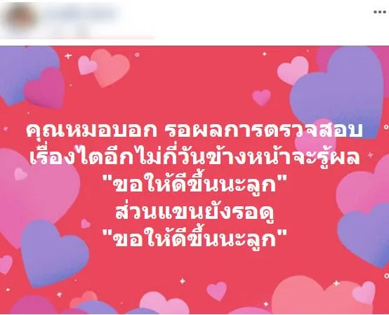 ต่อมา คุณพ่อของน้องเนยยังได้กลับมาอัพเดตอาการลุกชายเป็นระยะๆ อีกครั้งว่า “คุณหมอบอก รอผลการตรวจสอบเรื่องไตอีกไม่กี่วันข้างหน้าจะรู้ผล ขอให้ดีขึ้นนะลูก ส่วนแขนยังรอดู ขอให้ดีขึ้นนะลูก”