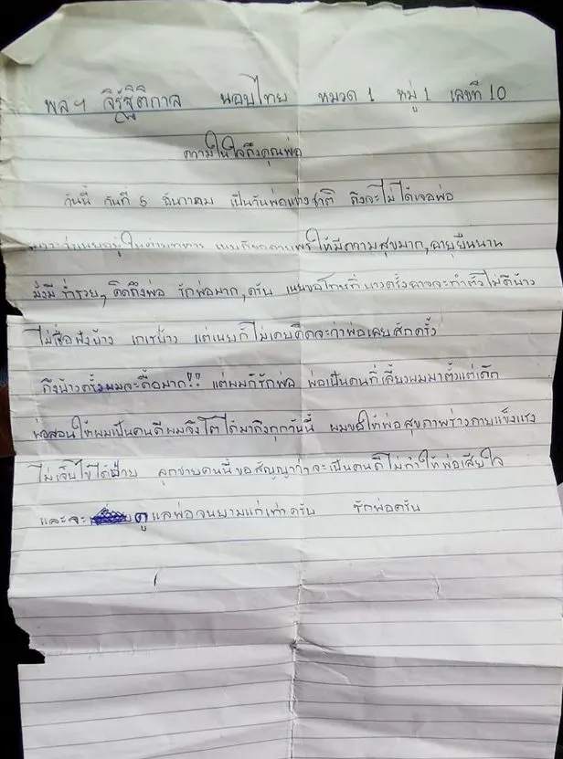 ขอโทษที่บางครั้งอาจจะทำตัวไม่ดีบ้าง ไม่เชื่อฟังบ้าง เกเรบ้าง แต่เนยก็ไม่คิดจะว่าพ่อเลยสักครั้ง ถึงบางครั้งผมจะดื้อมากแต่ผมก็รักพ่อ เพราะพ่อเป็นคนที่เลี้ยงดูมาตั้งแต่เด็ก สอนให้ผมเป็นคนดีผมจึงโตมาได้ถึงทุกวันนี้ ผมขอให้พ่อสุขภาพร่างกายแข็งแรงไม่เจ็บไข้ได้ป่วย ลูกชายคนนี้สัญญาจะเป็นคนดีไม่ทำให้เสียใจและจะดูแลพ่อจนยามแก่เฒ่าครับรักพ่อครับ ลงชื่อ พลฯ จิรัฐิติกาล นอบไทย