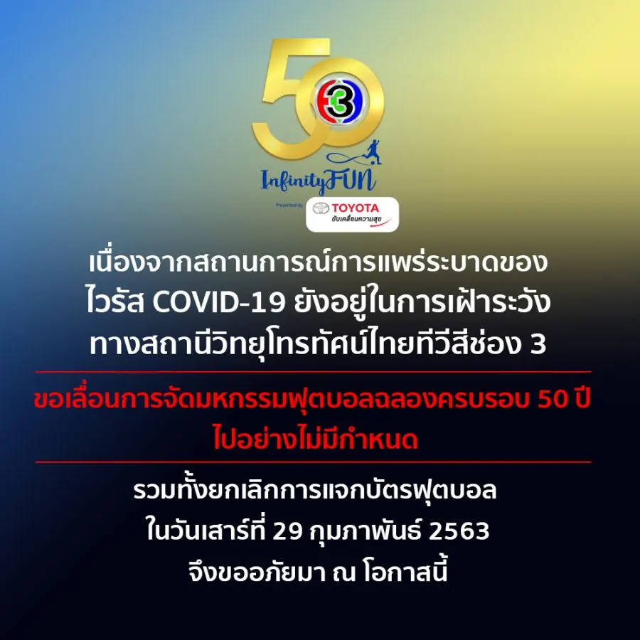"โควิด 19" ทำพิษ ช่อง 3 เลื่อนการจัดงานมหกรรมฟุตบอลฉลองครบรอบ 50 ปี ไม่มีกำหนด