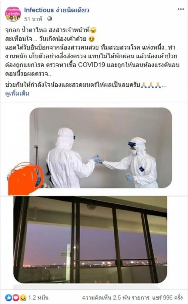 เป็นอีกหนึ่งเรื่องราวที่สร้างความสะเทือนใจให้กับผู้ที่พบเห็นและชาวโซเชียลเป็นจำนวนมาก เมื่อได้มีเพจเฟซบุ๊ค Infectious ง่ายนิดเดียว ได้โพสต์เรื่องราวของเจ้าหน้าที่ท่านหนึ่ง ที่ต้องอุทิศตนทำงานในห้องตรวจสอบโรค ที่ต้องคอยเก็บสิ่งที่นำมาตรวจสอบโรค โดยทำงานทั้งวันไม่ได้พักผ่อน จนกระทั่งป่วยและตอนนี้เจ้าหน้าที่ท่านนี้ต้องถูกกักกันโรค เพื่อตรวจสอบ ซึ่งในวันนี้เป็นวันเกิดของเจ้าหน้าที่ท่านนี้ ทางด้านเพจ Infectious ง่ายนิดเดียว จึงได้นำเรื่องราวของเจ้าหน้าที่ท่านนี้มาให้ทุกท่านได้ทราบกันว่า ทางเจ้าหน้าที่ผู้เสียสละต้องพบเจอเรื่องราวอะไรบ้าง