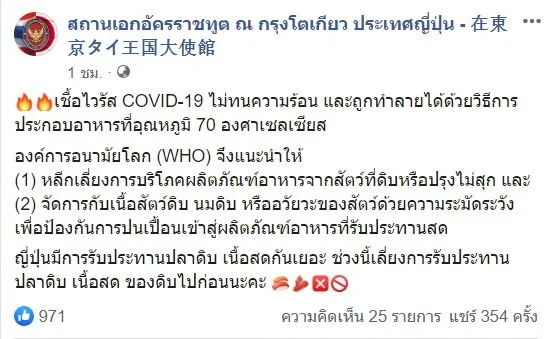 "เชื้อไวรัส COVID-19 ไม่ทนความร้อน และถูกทำลายได้ด้วยวิธีการประกอบอาหารที่อุณหภูมิ 70 องศาเซลเซียส