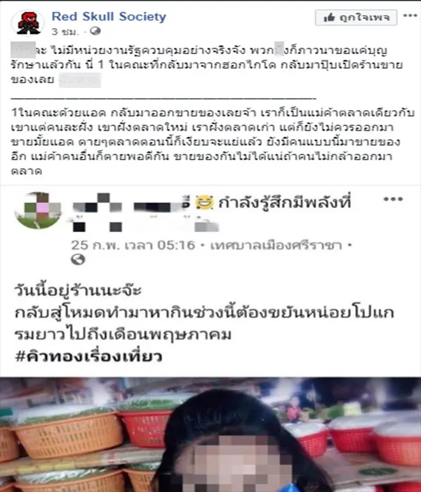 27 ก.พ. 63 แฟนเพจ Red Skull Society ได้รับเรื่องจากลูกเพจแฉแม่ค้าขนมจีนในพื้นที่ อ.ศรีราชา จ.ชลบุรี ซึ่งนั่งเครื่องเที่ยวบิน XJ621 ซัปโปโร-ดอนเมือง ลำเดียวกับปู่-ย่า ไปญี่ปุ่นติดเชื้อ โควิด 19 ว่ามีพฤติกรรมไม่รับผิดชอบสังคม หวั่นแพร่เชื้อเพราะเป็นแม่ค้าขายอาหาร
