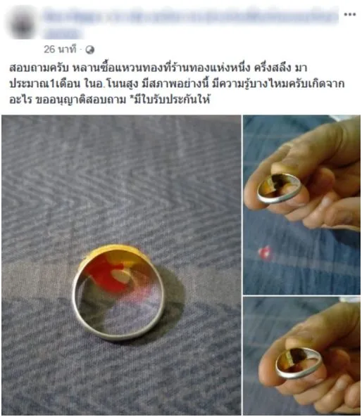 ผู้โพสต์ระบุข้อความว่า สอบถามครับ หลายซื้อแหวนทองที่ร้านทองแห่งหนึ่ง ครึ่งสลึงปมาประมาณ 1 เดือน ในอำเภอโนนสูง กลายเป้นอย่างนี้ มีความรู้บ้างไหมครับเกิดจากอะไร ขออนุญาตสอบถาม มีใบรับประกันให้