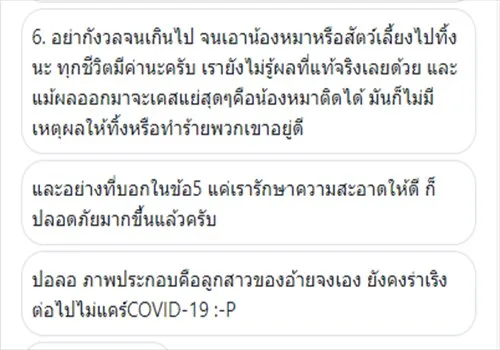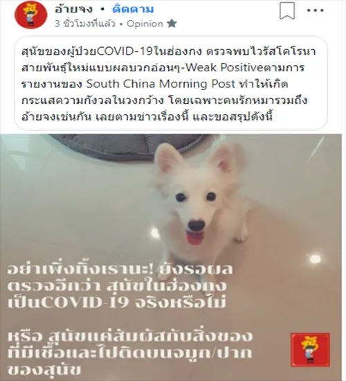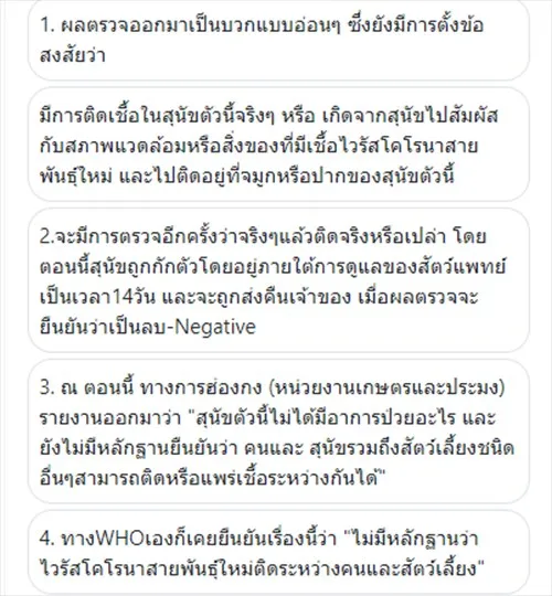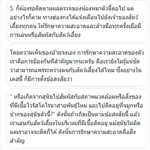 4. ทางWHOเองก็เคยยืนยันเรื่องนี้ว่า "ไม่มีหลักฐานว่า ไวรัสโคโรนาสายพันธุ์ใหม่ติดระหว่างคนและสัตว์เลี้ยง"