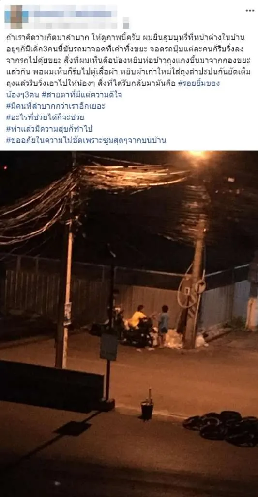 ผู้ใช้เฟซบุ๊กโพสต์ข้อความระบุว่า “ถ้าเราคิดว่าเกิดมาลำบาก ให้ดูภาพนี้ครับ ผมยืนสูบบุหรี่ที่หน้าต่างในบ้าน อยู่ๆก็มีเด็ก3คนนี้ขับรถมาจอดที่เค้าทิ้งขยะ จอดรถปุ้บแต่ละคนก็รีบวิ่งลงจากรถไปคุ้ยขยะ สิ่งที่ผมเห็นคือน้องหยิบห่อข้าวถุงแกงขึ้นมาจากกองขยะแล้วกิน พอผมเห็นก็รีบไปตู้เสื้อผ้า หยิบผ้าเก่าใหม่ใส่ถุงดำปะปนกันยัดเต็มถุงแล้วรีบวิ่งเอาไปให้น้องๆ สิ่งที่ได้รับกลับมามันคือ รอยยิ้มของน้องๆ 3 คน สายตาที่มีแต่ความดีใจ”