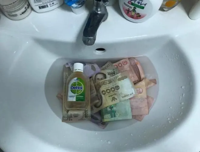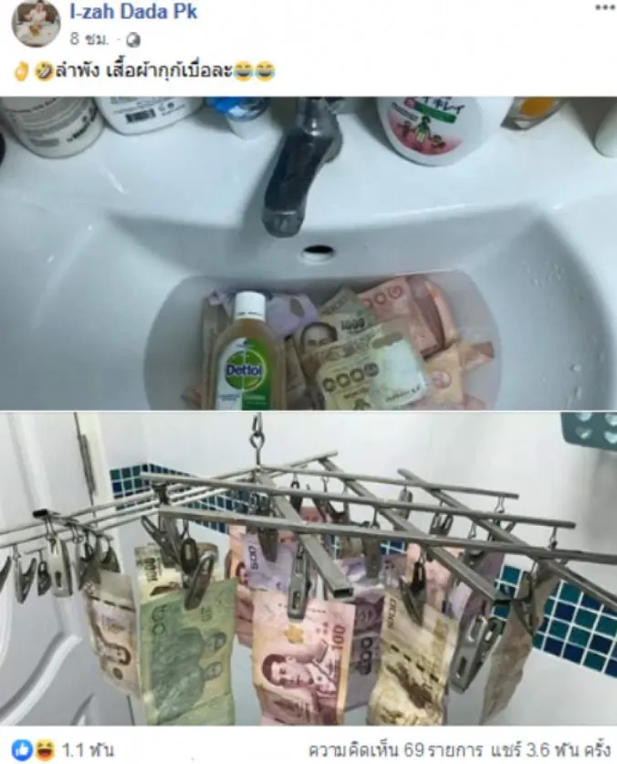 โดยเจ้าของโพสต์ได้ระบุข้อความว่า “ระแวงไปหมดแล้ว” โดยเป็นภาพเอาเงินไปล้างทำความสอาด พร้อมตากไว้เรียบร้อย งานนี้ต้องบอกเลยว่าหายห่วงได้เลยจ้า