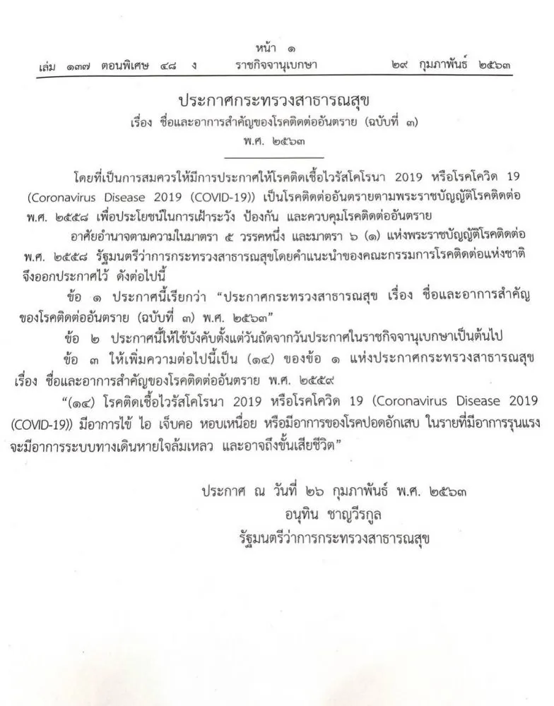 เว็บไซต์ราชกิจจานุเบกษา ได้ประกาศกระทรวงสาธารณสุข เรื่องชื่อและอาการสำคัญของโรคติดต่ออันตราย (ฉบับที่ 7) พ.ศ.2563 มีเนื้อความว่าดังนี้ครับ