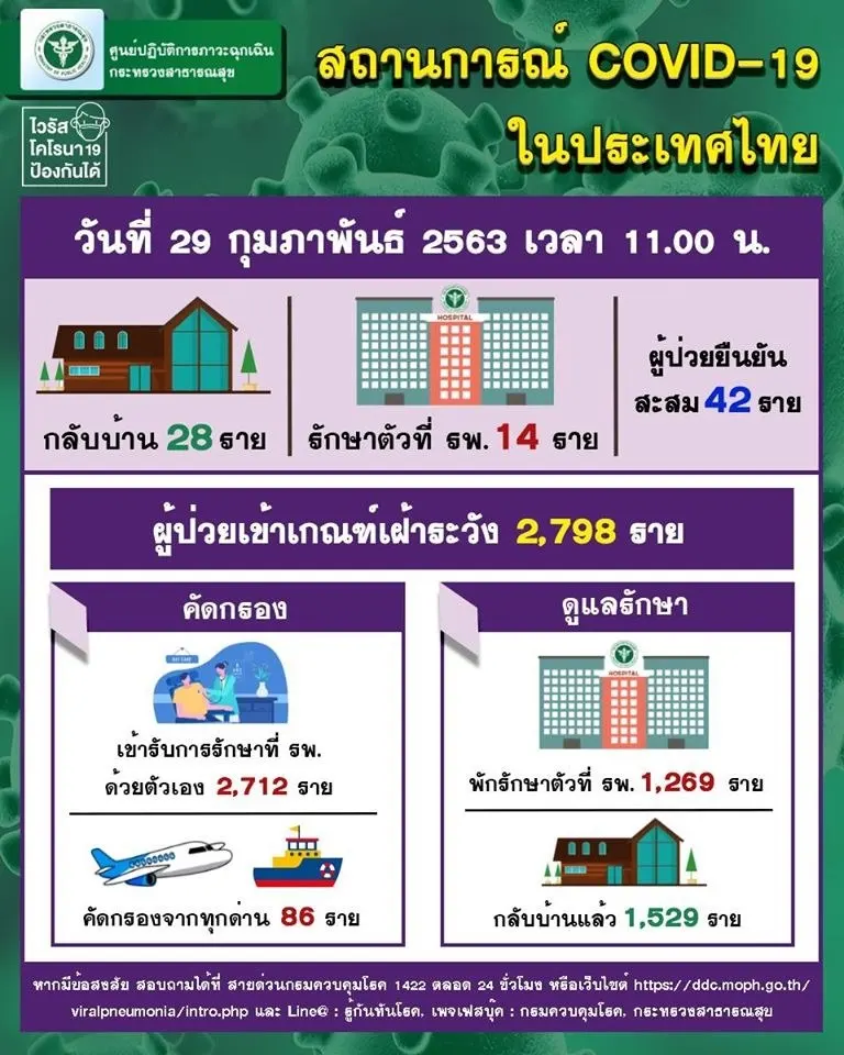 29 ก.พ. 2563 ที่กระทรวงสาธารณสุข (สธ.) นายอนุทิน ชาญวีรกูล รองนายกรัฐมนตรีและรมว.สาธารณสุข พร้อมด้วย นพ.สุขุม กาญจนพิมาย ปลัดกระทรวงสาธารณสุข แถลงสถานการณ์โรคติดเชื้อไวรัสโคโรนา 2019 ว่า วันนี้ได้รับรายงานผลการตรวจทางห้องปฏิบัติการทั้ง 2 แห่ง คือ กรมวิทยาศาสตร์การแพทย์ คณะแพทย์ศาสตร์โรงพยาบาลรามาธิบดี ยืนยันพบผู้ป่วยโรคติดเชื้อไวรัสโคโรนา 2019 เพิ่ม 1 ราย ผู้ป่วยเป็นเพศชาย อายุ 21 ปี อาชีพพนักงานขาย สัมผัสใกล้ชิดกับชาวต่างชาติ
