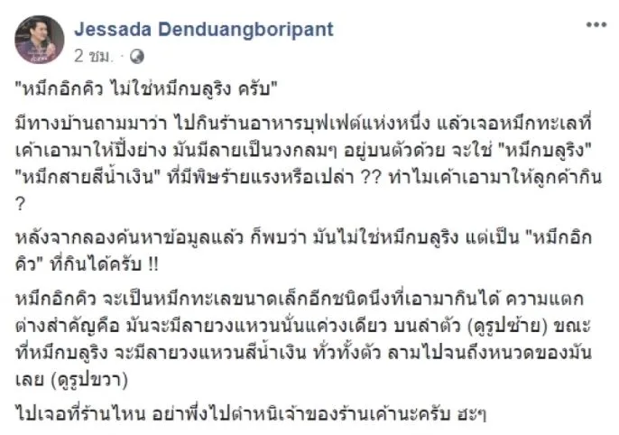 ต่อมา รศ.ดร.เจษฎา เด่นดวงบริพัทธ์ ได้ออกมาโพสต์ผ่านเฟซบุ๊กส่วนตัวระบุว่า หมึกอิกคิวไม่ใช่หมึกบลูริงครับมีทางบ้านถามมาว่าไปกินร้านอาหารบุฟเฟ่ต์แห่งหนึ่งแล้วเจอหมึกทะเลที่เค้าเอามาให้ปิ้งย่างมันมีลายเป็นวงกลมๆอยู่บนตัวด้วยจะใช่หมึกบลูริงหมึกสายสีน้ำเงินที่มีพิษร้ายแรงหรือเปล่าทำไมเขาเอามาให้ลูกค้ากิน