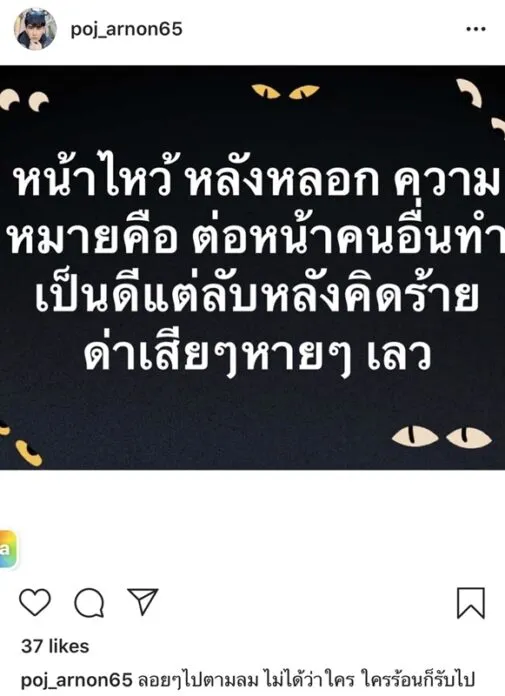 ล่าสุด( 29 ก.พ 63 ) ผูักำกับชื่อดังอย่าง พชร์ อานนท์ ก็ได้ออกมาโพสต์ไอจีลอยๆ พร้อมทั้งสำนวนไทยว่า “หน้าไหว้ หลังหลอก” ว่า ความหมายคือ ต่อหน้าคนอื่นทำเป็นดี แต่ลับหลังคิดร้าย ด่าเสียๆ หายๆ เลว