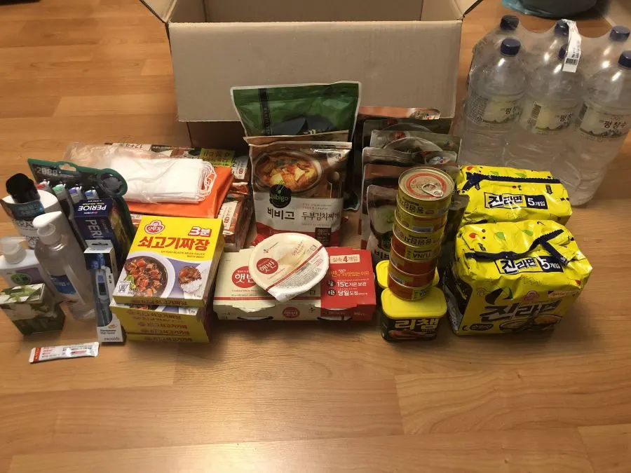 นี่คือข้าวสารอาหารแห้งที่รัฐบาลเกาหลีแจกจ่ายให้กับผู้ที่ต้องกักตัวอยู่บ้าน เพื่อรอผลตรวจเชื้อไวรัส COVID-19 จะมีการโทรสอบถามอาการทุกวัน วันละ 2 ครั้ง ถ้าทำงานไม่ได้ รัฐบาลจะจ่ายเงินชดเชยให้กรณีที่ีขาดรายได้