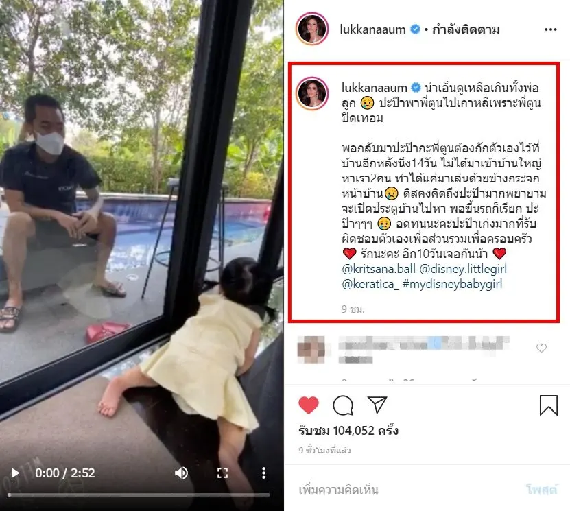 ซึ่ง สาวอุ้ม นั้นได้โพสต์ระบุข้อความว่า น่าเอ็นดูเหลือเกินทั้งพ่อลูก ปะป๊าพาพี่ตูนไปเกาหลีเพราะพี่ตูนปิดเทอมพอกลับมาปะป๊ากะพี่ตูนต้องกักตัวเองไว้ที่บ้านอีกหลังนึง14วัน ไม่ได้มาเข้าบ้านใหญ่หาเรา2คน ทำได้แค่มาเล่นด้วยข้างกระจกหน้าบ้าน ดิสคงคิดถึงปะป๊ามากพยายามจะเปิดประตูบ้านไปหา พอขึ้นรถก็เรียก ปะป๊าๆๆๆ อดทนนะคะปะป๊าเก่งมากที่รับผิดชอบตัวเองเพื่อส่วนรวมเพื่อครอบครัว รักนะคะ อีก10วันเจอกันน้า @kritsana.ball@disney.littlegirl@keratica_#mydisneybabygirl
