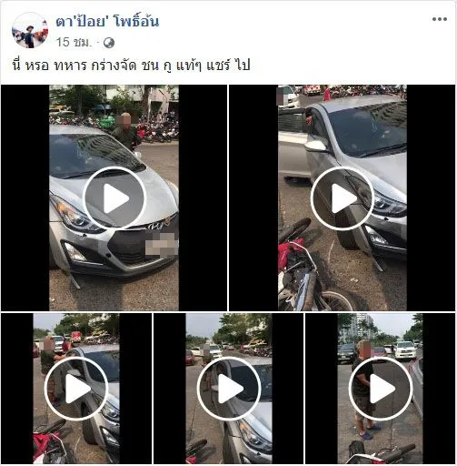 ชนแล้วกร่าง วันที่ 29 ก.พ. สมาชิกเฟซบุ๊ก "ตา'ป้อย' โพธิ์อ้น" ได้โพสต์คลิปเหตุการณ์ขณะที่ถูกรถเก๋งสีเทาขับชนรถจยย.จนล้มคว่ำกลางถนน ได้รับความเสียหาย และชายคนขับใส่เสื้อสีเขียวขี้ม้า ซึ่งผู้โพสต์ระบุว่าเป็นทหาร แสดงความไม่พอใจ และโวยวายตลอด โดยระบุข้อความว่า "นี่ หรอ ทหาร กร่างจัด ชน กู แท้ๆ แชร์ ไป"