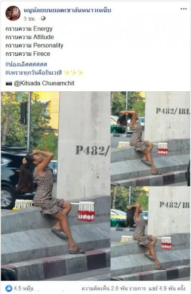 เป็นอีกหนึ่งภาพที่ทำเอาชาวโซเชียลต่างพากันสนใจและเข้ามาแสดงความคิดเห็นเป็นจำนวนมาก เมื่อผู้ใช้เฟสบุ๊ค Kitsada Chueamchit ได้ตาดี โฟกัสเลนส์กล้องไปที่น้องคนขายพวงมาลัย ที่กำลังนั่งอยู่ตรงริมถนน พร้อมกับวางไม้พวงมาลัยไว้ข้างๆตัว แล้วเอามือรวบผมขึ้นเพื่อที่จะมัดผม ซึ่งต้องบอกเลยว่ายอมใจคนถ่ายจริงๆ ที่ถ่ายรูปดังกล่าวออกมา ได้เหมือนนางแบบบนรันเวย์เลยทีเดียว